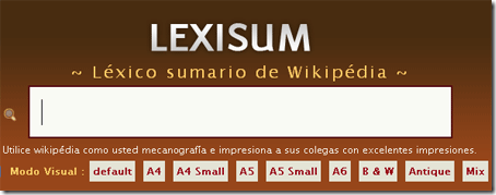 Lexicum, es una generosa aplicación web por la que nos permite buscar artículos de la wikipedia y obtener un extracto de los mismos al instante, incluyendo enlaces a los artículos completos en la propia Wikipedia, y con la ventaja para nosotros de tener al idioma español soportado dentro de los 9 idiomas disponibles.